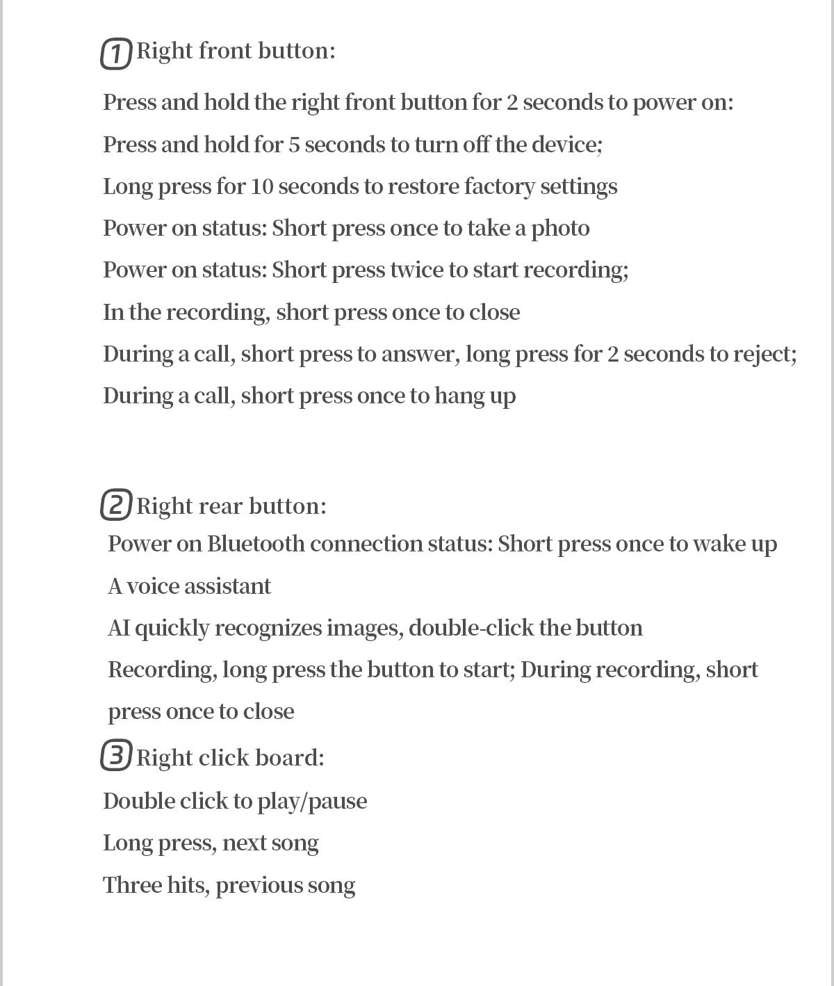 AI photo recognition answers, photography, video, recording, AI dialogue intelligent interaction, Bluetooth calls, local music, music playback (switching, pausing music appreciation), low-power JL7018F main control chip, long-lasting battery life, convenient operation of dual physical buttons + dual touch buttons, comfortable wearing of 35g lightweight machine weight, configurable sunglasses, blue light and other lenses, 270MA large battery, ultra-low power consumption (supports continuous recording for more than 2 hours without heating), connect to ChatGPT's advanced model, high image recognition ability and high accuracy