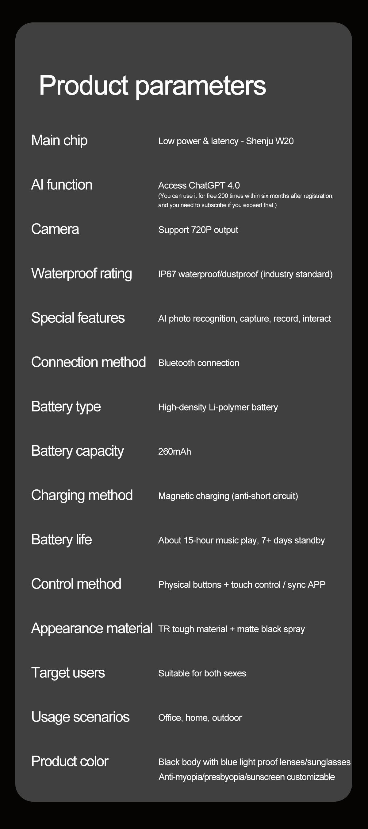 AI photo recognition and answering, photo taking, video recording, recording, AI dialogue intelligent interaction, Bluetooth calls, local music, music playback (switch, pause music appreciation), APP can transfer pictures via Bluetooth and save them locally, low-power W20 main control chip.