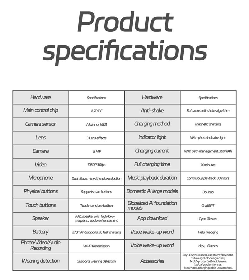 Functions: Camera function (photo taking & video recording), WIFI image transmission, sound recording, AI translation (support 100+ languages), AI photo recognition, AI intelligent question & answer interaction, wireless call (answer & reject), voice assistant (AI voice wake-up), built-in headphones & speaker (stereo sound), music playback, anti blue light, UV protection.